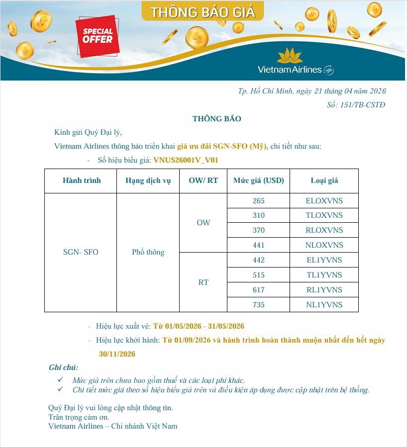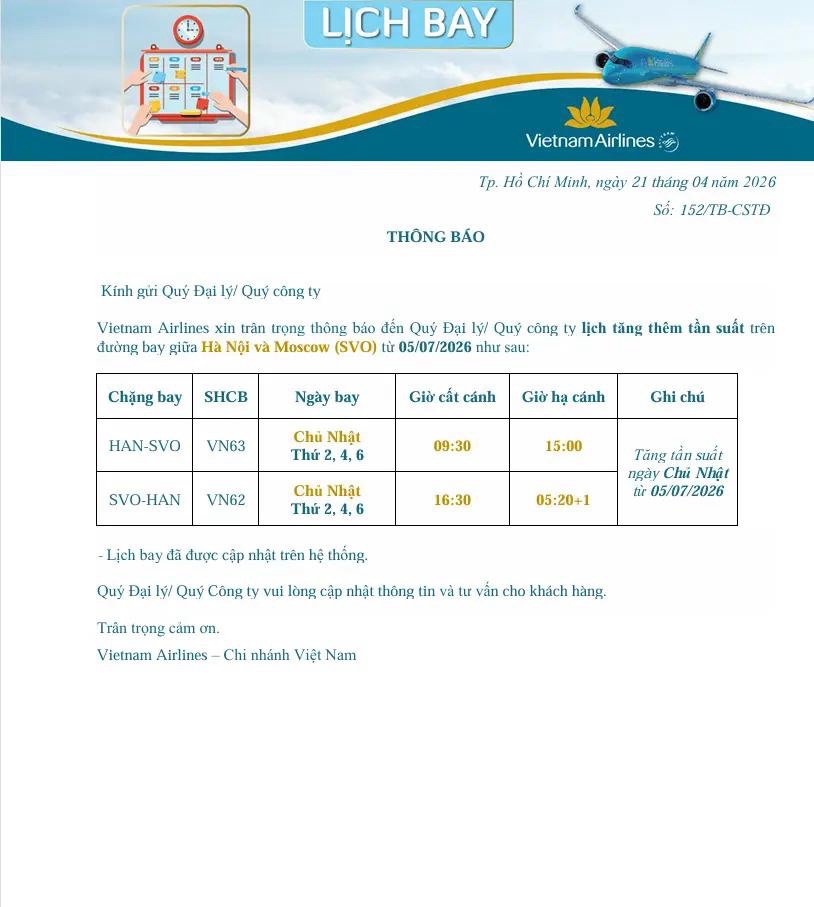- Giá ưu đãi SGN-SFO (Mỹ) và Tăng tần suất giữa Hà Nội và Moscow (SVO) ngày Chủ nhật