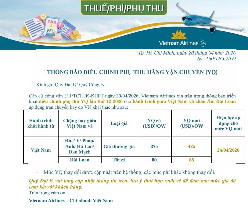 Vietnam Airlines – Điều chỉnh phụ thu hãng vận chuyển (YQ)