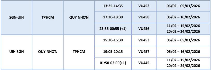 Nhằm đáp ứng tối đa nhu cầu đi lại tăng cao của hành khách trong dịp cao điểm Tết Nguyên Đán Bính Ngọ 2026, Vietravel Airlines Khai thác trở lại đường bay TP. Hồ Chí Minh (SGN) – Quy Nhơn (UIH) từ ngày 06/02/2026 với giá vé đặc biệt ưu đãi chỉ từ 1K, giờ bay khai thác như sau: